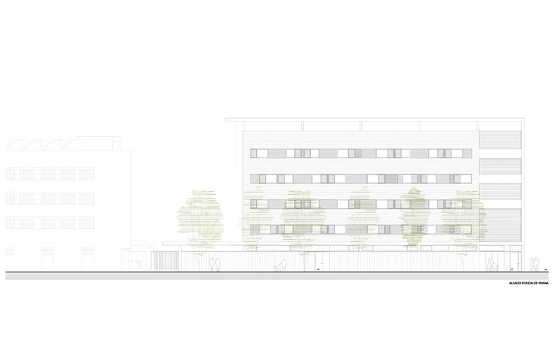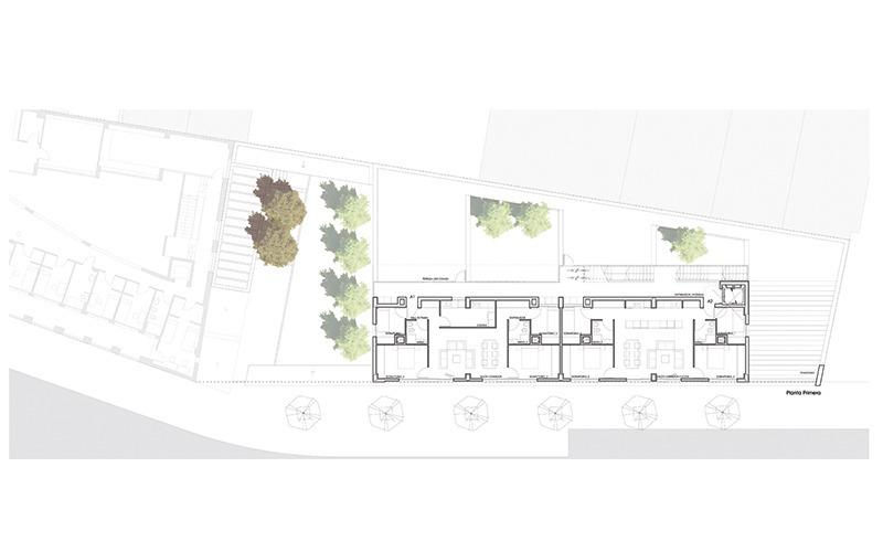 El acceso a los alojamientos se realiza a través de una galería abierta mediante una celosía a los espacios libres de la parcela y que tiene la intención de convertirse en el espacio donde los residentes se relacionen entre ellos. Una escalera lineal comunica todas las plantas, atravesando el edificio diagonalmente en su fachada trasera, configurando pequeños espacios en doble altura que comunican visualmente las plantas. Debajo de la escalera se crean a su vez zonas donde poder dejar las bicicletas, los carros, etc.