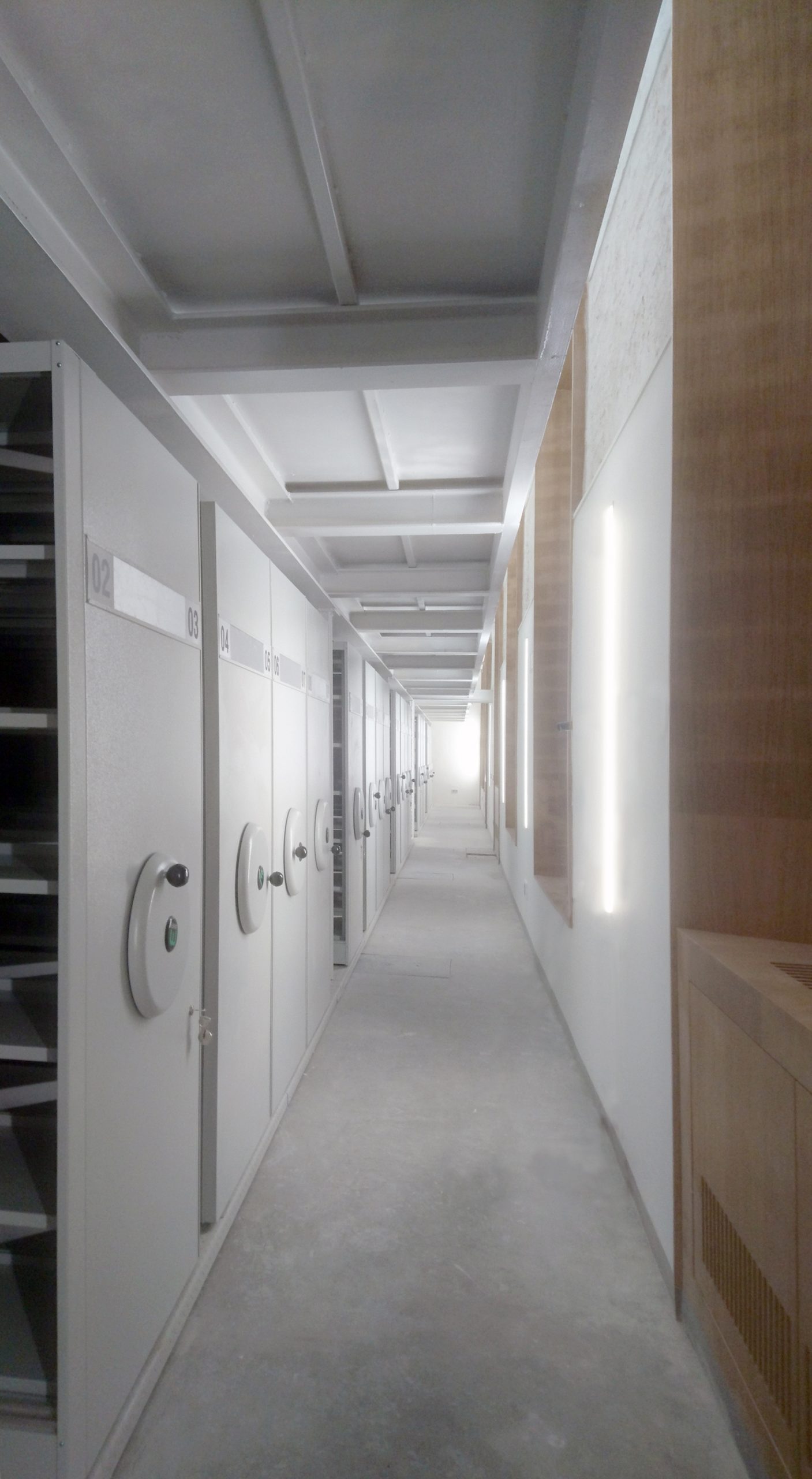 El nuevo programa para este espacio será una zona de despacho amplia e independiente con acceso desde uno de los patios, un vestíbulo de independencia necesario por la sectorización que la normativa de incendios exige, un área de consulta y dos salas en las que se instalarán los archivos compactos.