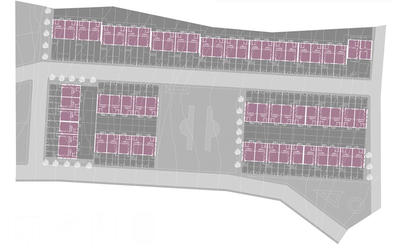 Al no disponer de la primera manzana para conectar el límite urbano con nuestra actuación, la propuesta presenta un frente de fachada en el acceso desde el centro de la población. Por esta razón, en la manzana C se cambia la orientación inducida por la propia urbanización, girándola 90° y consiguiendo una hilera de viviendas apoyada sobre una calle horizontal, que hará de frente al resto de la promoción que se escalona siguiendo la pendiente del terreno.