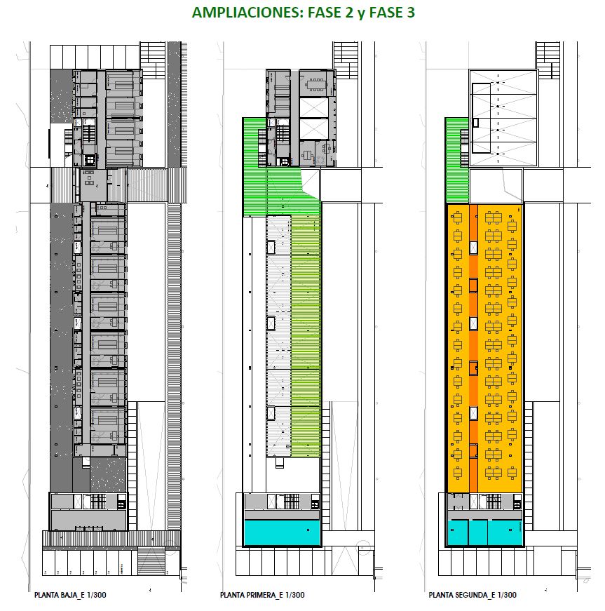En el edificio Bioincubadora que proyectamos y construimos en el Campus de la Salud y la Innovación de Cáceres, en UTE con Francisco Javier Robustillo Yagüe, estudiamos una posible ampliación al doble y triple de su capacidad actual, mediante ampliaciones en dos fases, que a pesar de nuestras reservas iniciales por cambiar la imagen global de un edificio recién acabado, nos parece que el resultado puede ser interesante.