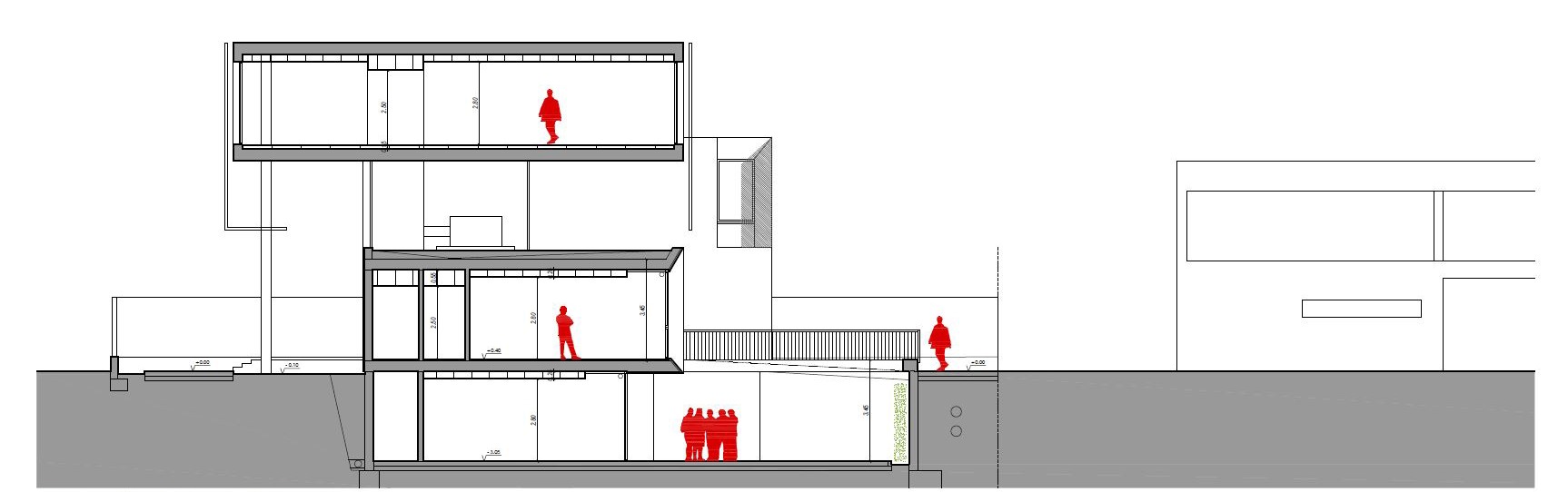 Consiste en levantar una planta sobre el volumen existente, dejando una planta técnica intermedia entre lo construido y la ampliación, que aprovecha la cubierta actual del edificio con todas sus instalaciones en la misma posición. En esta planta técnica también se implementaría la maquinaria de la nueva planta superior. La ampliación cubre toda la planta baja e incluso la sobrepasa para bajar al suelo y organizar un acceso independiente.