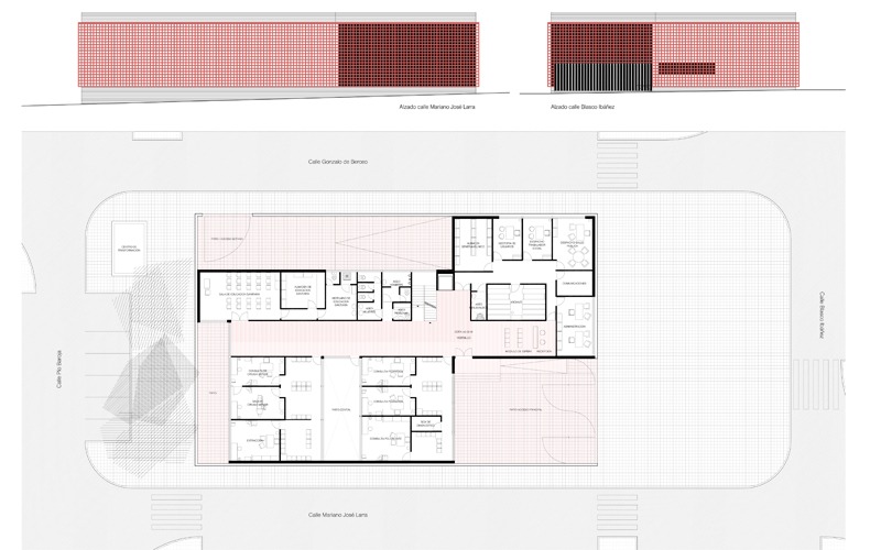 Se construyen dos plantas y un sótano iluminado por los patios que llegan hasta él, y en las de atención al público presentan dos zonas claramente diferenciadas y unidas por el vestíbulo que les hace de charnela: los usos asistenciales de mayor superficie en el sentido de la mayor dimensión a la izquierda del acceso, y los generales ocupando el fondo del vestíbulo.