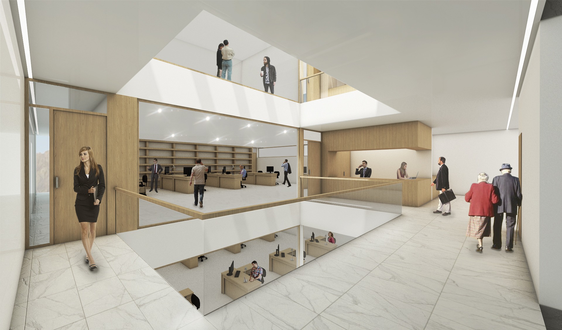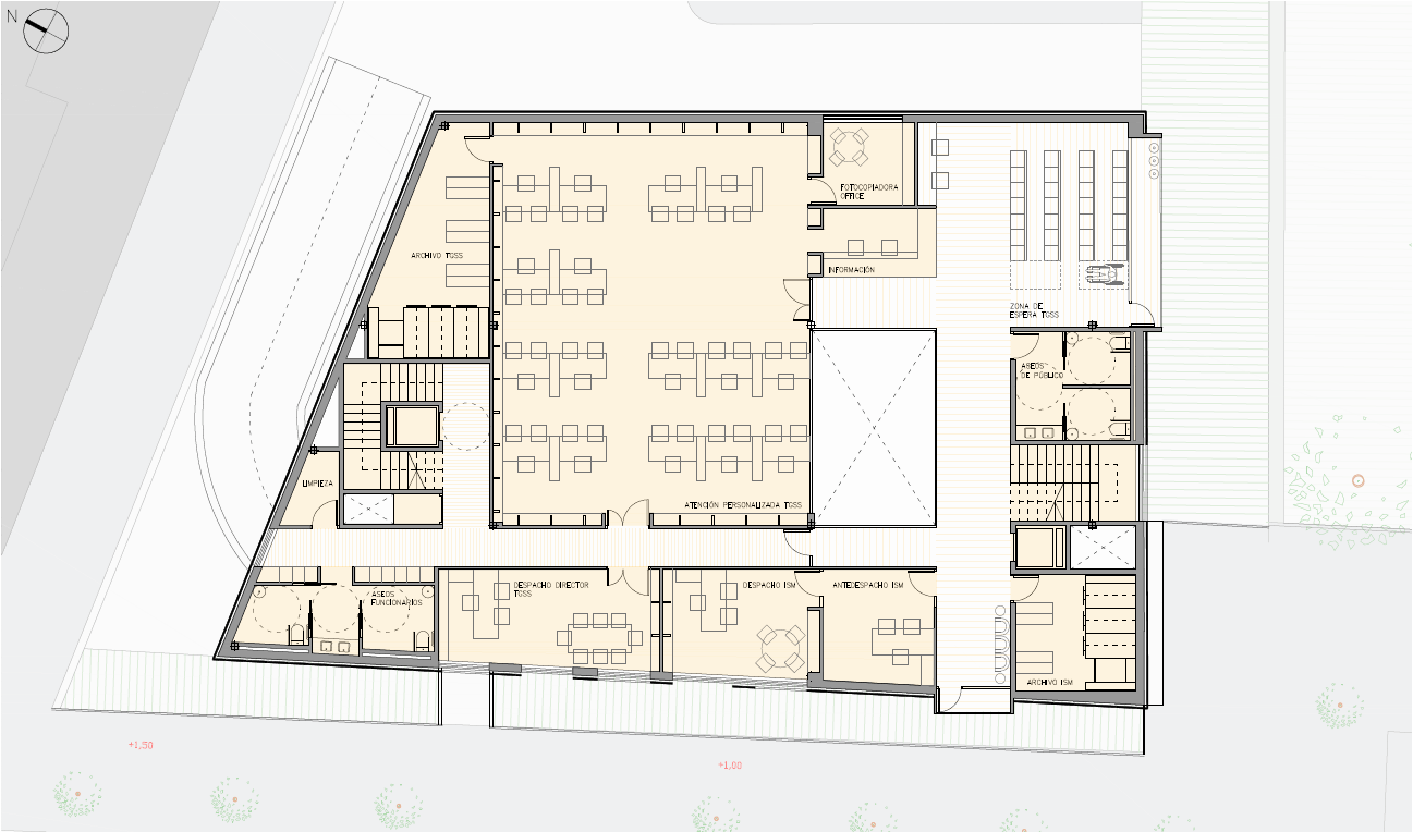 Las zonas públicas se ubican en las fachadas sur y este, mientras que el área restringida se sitúa en la fachada oeste. Los archivos, escaleras y espacios de servicio se localizan en la fachada norte, con circulaciones públicas y de personal claramente diferenciadas. Las amplias zonas de trabajo, atención al público y espera se encuentran en el centro del edificio.