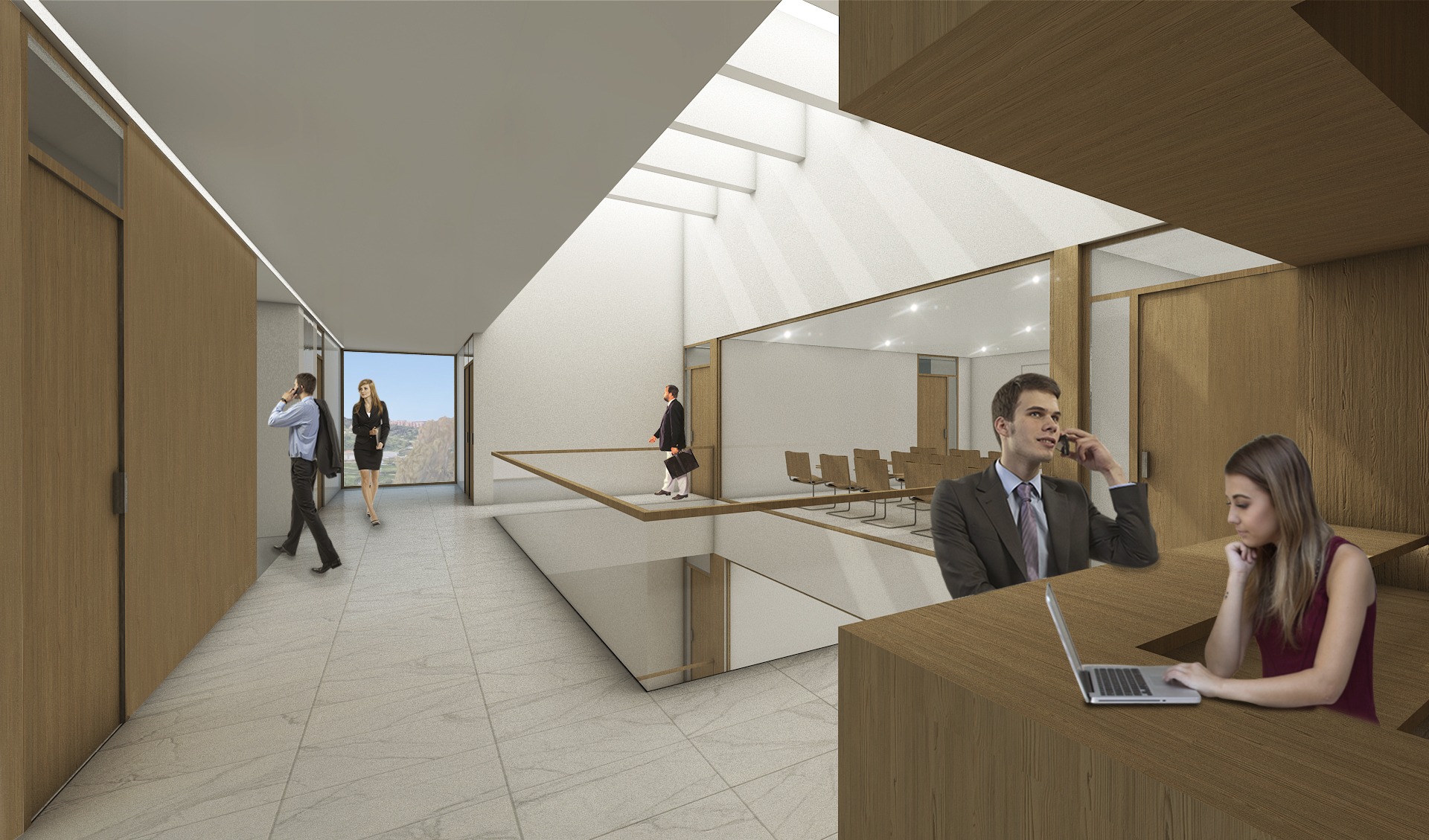 El edificio se organiza funcionalmente en torno a un hall de entrada en triple altura, que sirve como sala de espera en la planta baja y como punto de referencia visual en el recorrido por todas las plantas. Este espacio se cierra superiormente con un lucernario que inunda de luz natural el centro del edificio, creando un ambiente luminoso y acogedor.