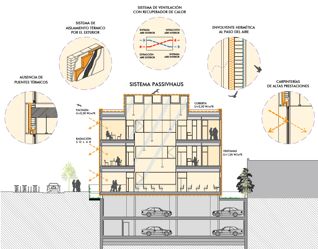 Una de las particularidades del terreno es la diferencia de cota entre la rasante de la calle y el aparcamiento, que oscila entre 1 y 1,5 metros. Esta diferencia permite acceder a la planta baja desde la cota de calle y ventilar e iluminar de forma natural el sótano -1.