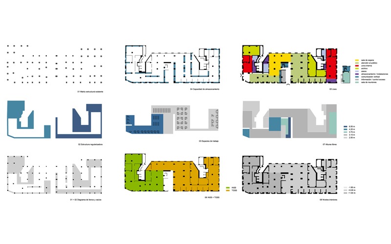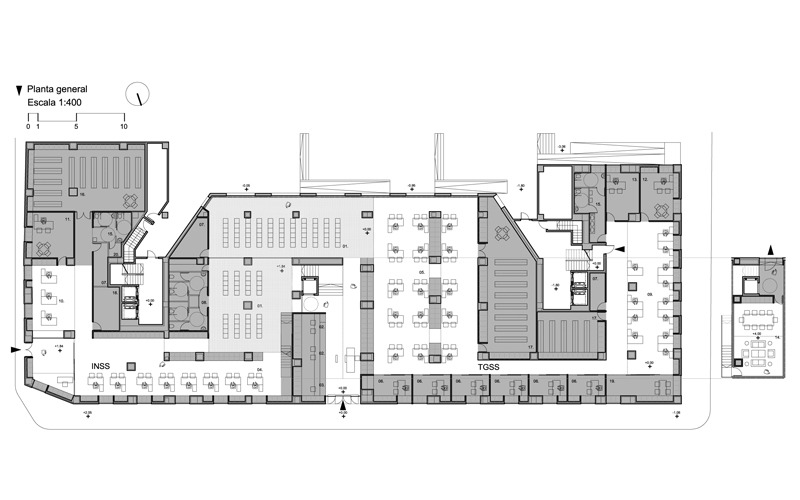 Muros equipados, bandas programáticas, elementos espesos que se adosan y enroscan, maleables, de densidad variable, estos han sido los conceptos de partida con los que hemos enfocado el concurso para la Adecuación de un local para Oficina Integral de la Seguridad Social en Marbella, convocado por la Dirección Provincial de Málaga del Instituto Nacional de la Seguridad Social.