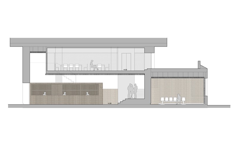 El proyecto se genera a través de una banda continua que adosándose al perímetro da lugar a una planta libre con dos tipos de zonas: las de carácter público, de recepción, de espera, de ruido, que se sitúan en el corazón del local; las de silencio, privadas, destinadas al trabajo, que se desarrollan siempre perimetralmente, buscando aquellos paramentos del local en contacto con el exterior.