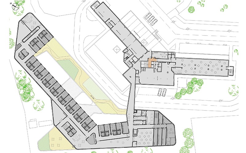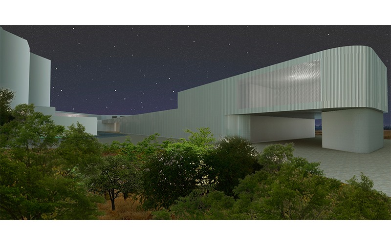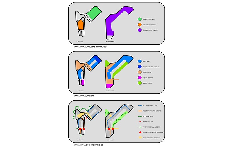 La ampliación de la residencia se propone con un nuevo edificio que se acomoda paralelo al existente en su fachada oeste, generando una calle de considerable longitud con expansiones del espacio exterior en el interior del edificio para el acceso principal donde se proyecta un apeadero cubierto para carga/descarga de usuarios y un patio ajardinado, la entrada de servicio también cubierta o las salidas de emergencia.