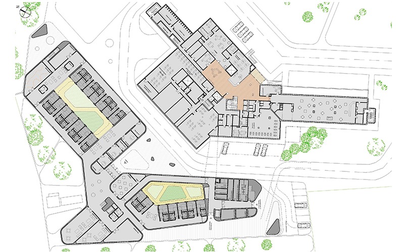 La organización general de la ampliación en planta baja consiste en un acceso central con apeadero entre las áreas de demencia y dependencia que cuentan con sus propios espacios de relación y convivencia, una la zona de servicio en el extremo sur al comienzo de la calle y el área común a continuación del acceso, en el extremo oeste en contacto con las zonas ajardinadas del lindero oeste de la parcela, más íntimas por ser de menor tamaño.