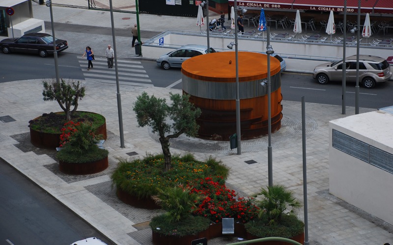 Se integra también en el diseño de la plaza el paso del carril bici por José Laguillo y las entradas peatonales del parking. Como materiales se usan el acero cortén para el mobiliario de la plaza y el acero inoxidable con vidrio para las entradas peatonales al aparcamiento.