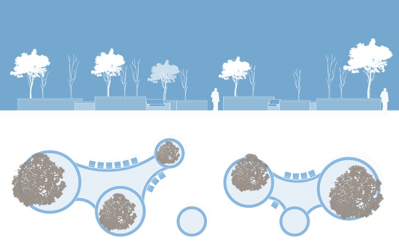 Recuperación del espacio delimitado por la isleta de tráfico, que es usado como aparcamiento en superficie, como espacio público dotado de zonas de juego, fuentes, vegetación y espacios reservados entre las piezas ajardinadas para bancos que, protegidos por la vegetación, hagan esta plaza un lugar de descanso recogido y grato.