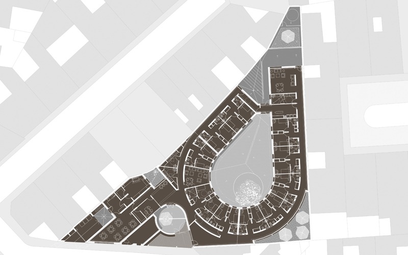 El proyecto se asienta sobre una doble decisión: por un lado, hacer un edificio que responda a la ciudad, a las necesidades que nos plantea construir un espacio urbano, y por otro, la decisión de hacerlo introvertido, que disfrute de los espacios interiores y tenga la privacidad necesaria que debe tener una casa, contando en este caso con un edificio de poca fachada al exterior y una gran superficie interior entre medianeras, por lo que el conjunto se alinea a fachada, como ocurre en su entorno, y genera unos patios interiores donde se vuelcan la mayor parte de sus estancias.