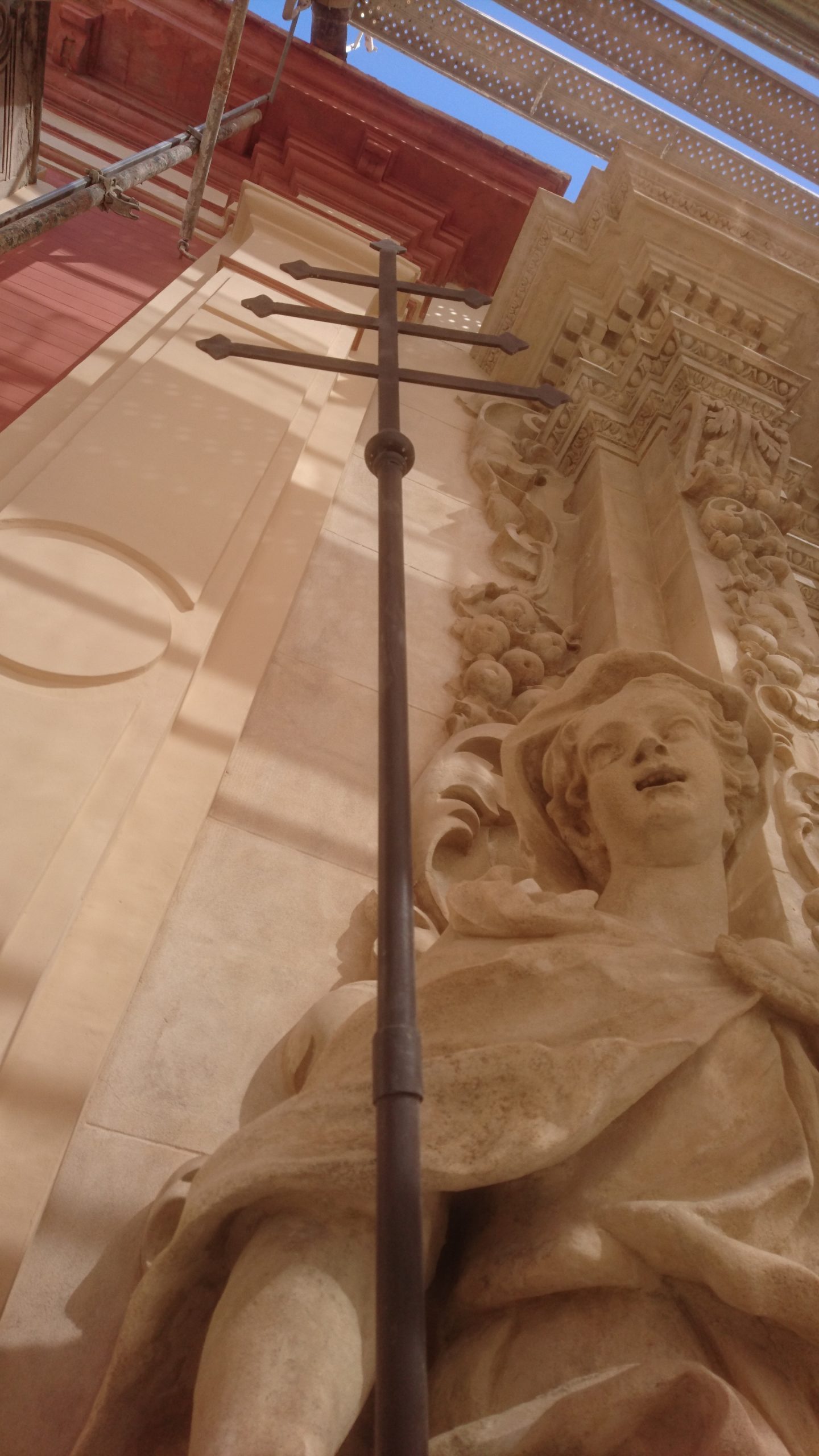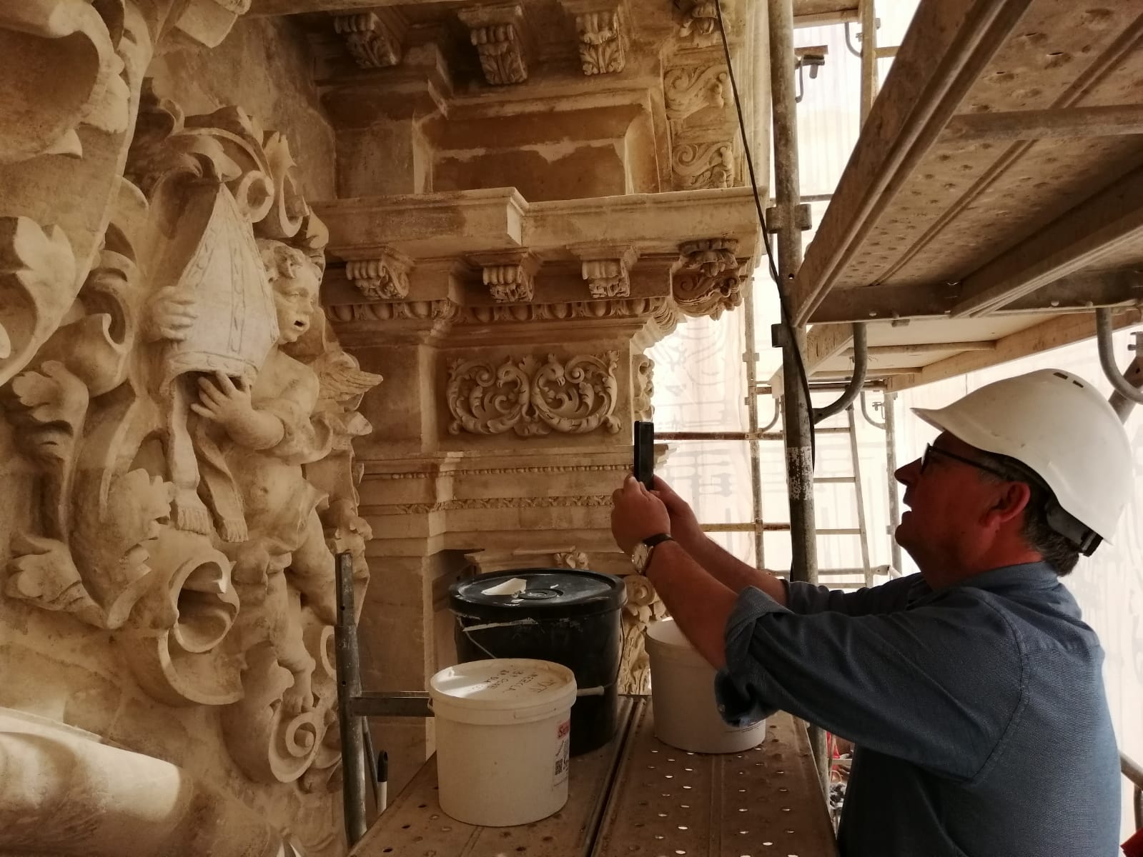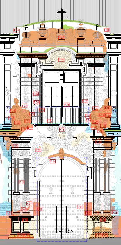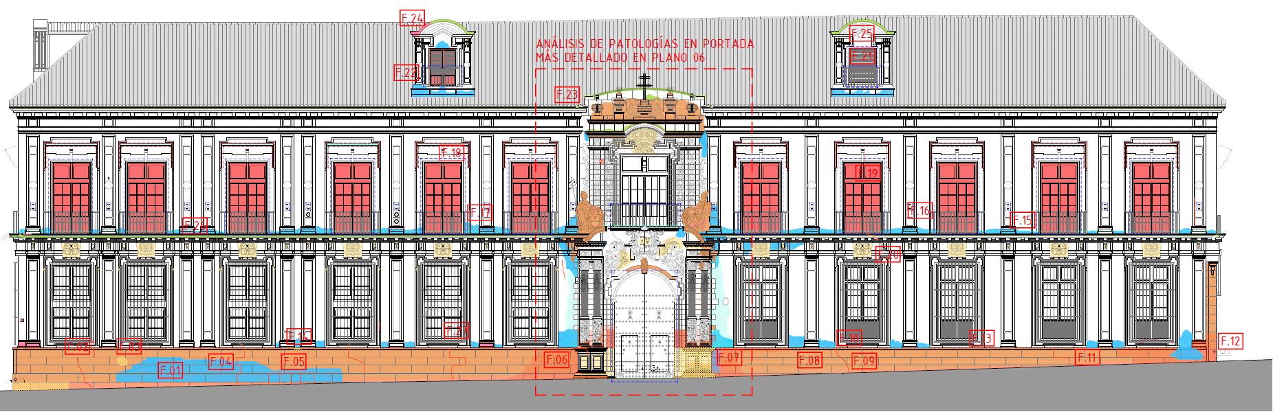 Se llevaron a cabo trabajos de limpieza, consolidación y reparación de los elementos de cantería, así como la restauración de los detalles ornamentales que adornan las fachadas del edificio.
